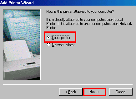 Printer],please select "Next"-->tick "Local printer"-->"Next"